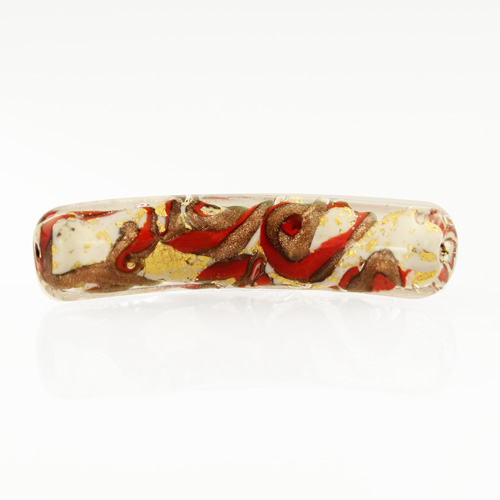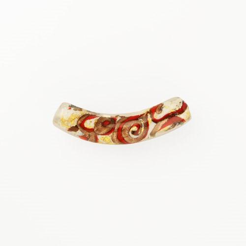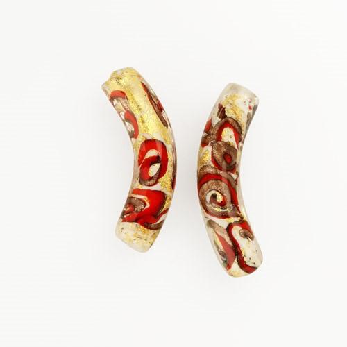 Perla di Murano tubo curvo Medusa Ø9x42. Vetro bianco, rosso, foglia oro e avventurina. Foro passante.