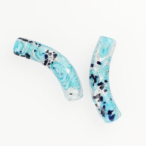 Perla di Murano tubo curvo Medusa Ø9x42. Vetro turchese, foglia argento e avventurina blu. Foro passante.