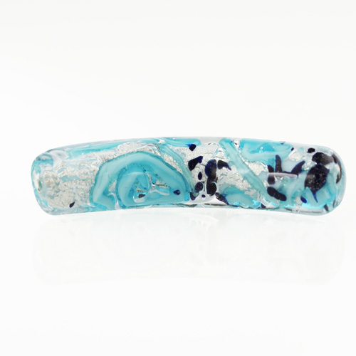Perla di Murano "made in Italy", dall'inusuale forma curva [Ø9x42 mm]. Il vetro é turchese, foglia argento e avventurina blu, con foro passante. La particolare decorazione detta “Medusa” dona movimento e vivacità al colore, aspetto tipico del vetro artistico veneziano. La sua forma permette di ottenere diversi effetti, ottenendo oggetti d'alta bigiotteria artigianale. Non è solo un hobby, ma un'attività propria della nostra tradizione.
