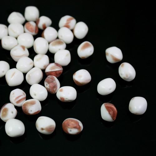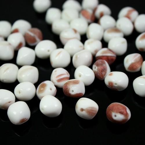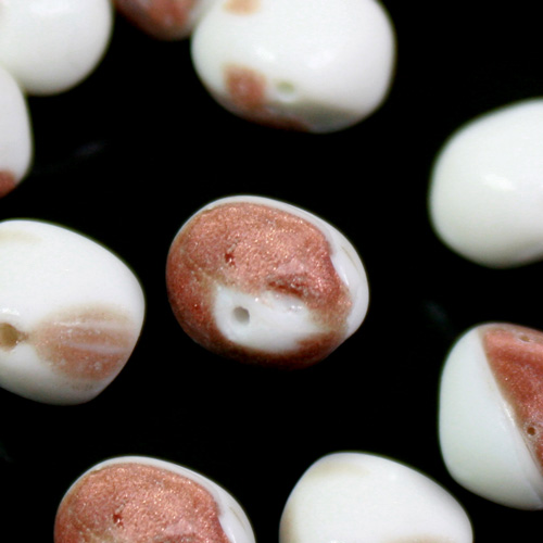 Perla di forma ovaloide, plasmata  in pasta di vetro bianca screziata avventurina. Ogni perla misura circa 9 mm di larghezza e 11 mm di altezza, tuttavia è possibile riscontrare qualche leggera differenza, ciò non è da considerarsi  un difetto, ma un sinonimo di qualità e unicità. Tutte le perle inoltre, sono dotate di un foro per l'inserimento di spilli o fili, di diametro 0.8 mm. Perfette per la creazione di monili e gioielli, sono utilizzabili anche per la valorizzazione di confezioni regalo e composizioni floreali, inoltre arricchiscono addobbi e mise en place.