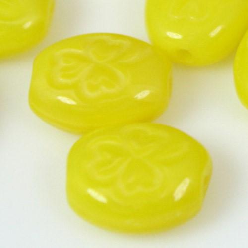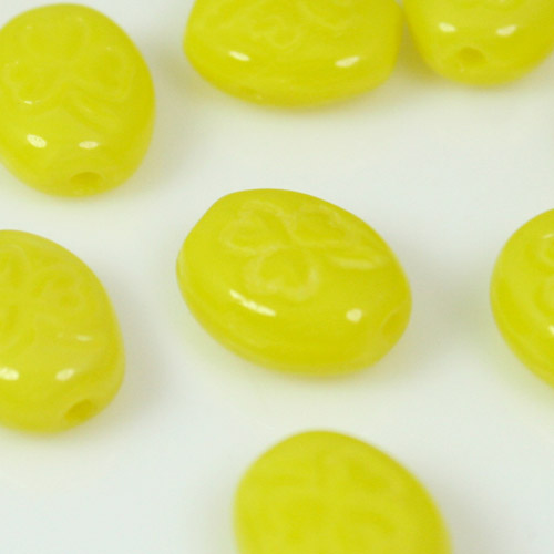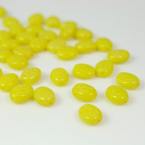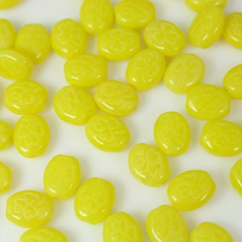 Perla di forma ovale, plasmata in pasta di vetro gialla. Ogni perla misura all'incirca 9 mm di larghezza e 10 mm di altezza, inoltre tutte le perle sono dotate di un foro, passante lungo l'altezza, di diametro 0.8 mm per l'inserimento di fili e spilli. Il dettaglio che rende unica questa perla è la particolare lavorazione costituita da una piccola incisione a forma di trifoglio. Altra caratteristica è il colore vivace, ottenuto con tecniche di lavorazione del vetro antiche e non più in auge. Perfetta per creare gioielli e pendenti si addice anche alla decorazione di tessuti e oggetti, oltre che come elemento per la valorizzazione di confezioni regalo, composizioni floreali e addobbi di home decor. Nel sito, potrai trovare numerose altre perle con varianti di colore forma e dimensione, in grado di soddisfare la tua voglia di creatività.