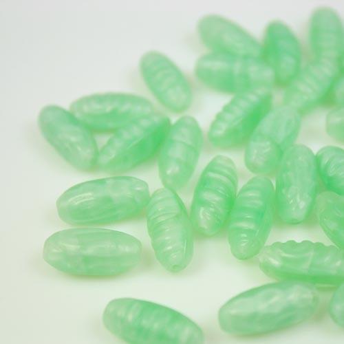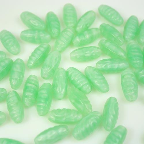Perla di forma ovoidale allungata, in pasta di vetro verde seta. Ogni perla misura all'incirca 8 mm di larghezza e  17 mm di altezza, ed è provvista di un foro, di diametro 0.8 mm, che consente l'inserimento di fili e spilli per la creazione di collane o catene. Perla dal colore delicato, caratterizzata dall'utilizzo di una base in vetro seta, altro dettaglio da notare è la forma elaborata, creata con tecniche antiche non più applicate. A sito è possibile reperire ulteriori forme, colori e dimensioni oltre a una vasta gamma di articoli simili.