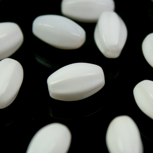Perla di forma ovoidale, realizzata in pasta di vetro bianco. L'articolo misura complessivamente 6 mm di larghezza e 12 mm di altezza. La perla è dotata di foro passante in altezza di diametro 0.8 mm.