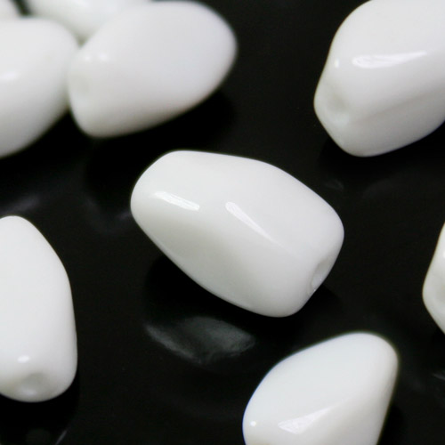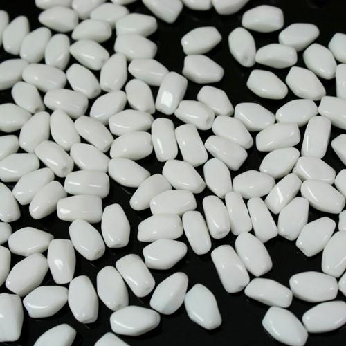 Perla di forma poliedrica realizzata in pasta di vetro bianca. Tutte le perle misurano circa 5 mm di larghezza e 10 mm di altezza, inoltre sono tutte provviste di un foro, per l'inserimento di spilli e fili, di diametro 0.8 mm. Le perle sono tutte uguali, tuttavia possono differire tra loro di qualche dettaglio, questa eventualità non è da identificare come un difetto, ma come un segno della loro unicità. La loro forma insolita rende queste perle molto particolari, inoltre il colore bianco puro le rende adatte a diversi tipi di utilizzo. Tali caratteristiche sono ottenute con tecniche di lavorazione antiche non più utilizzate. Perla ideale per la creazione di gioielli e pendenti, perfetta anche per valorizzare addobbi natalizi e strenne, inoltre può essere utilizzata per la decorazione di elementi di illuminazione.