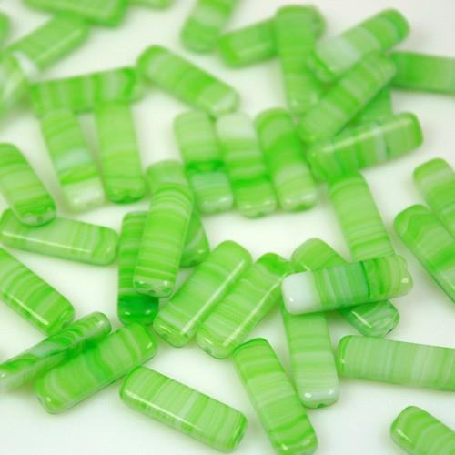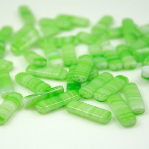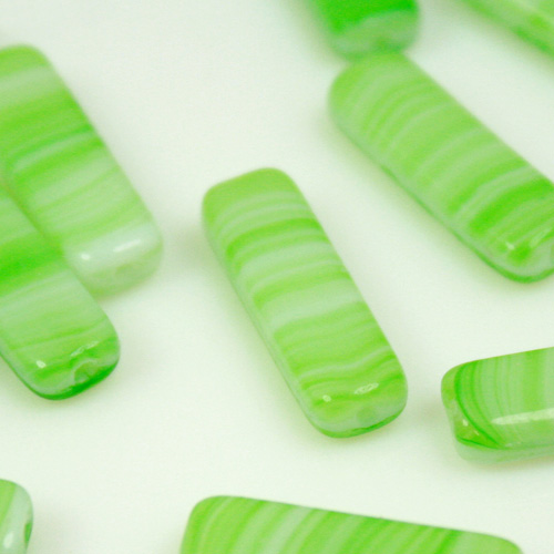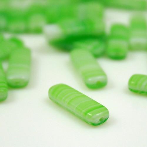 Perla a forma di prisma, realizzata in pasta di vetro verde, screziata bianca. Tutte le perle misurano circa 6 mm di larghezza e 17 mm di altezza. Ogni perla è dotata di un foro per l'inserimento di fili e spilli, di diametro 0.8 mm. Particolarità di questa perla è la sua screziatura, che va dal verde al bianco, ottenuta con procedure di lavorazione del vetro antiche e non più in uso. Perfetta per la creazione di gioielli e pendenti, è ideale anche per adornare confezioni regalo, composizioni floreali, può essere inoltre perfetta per adornare addobbi di home decor.