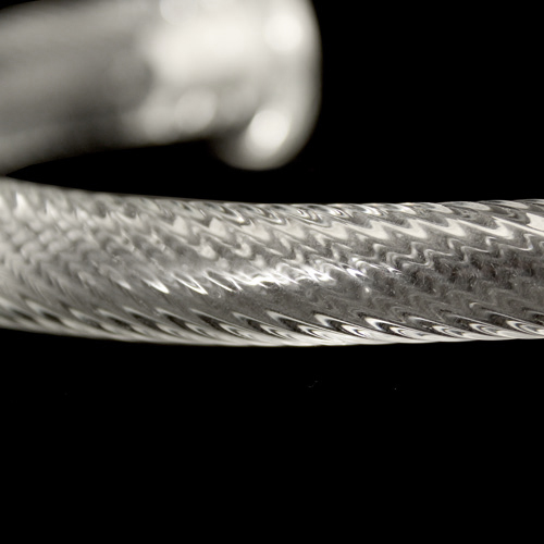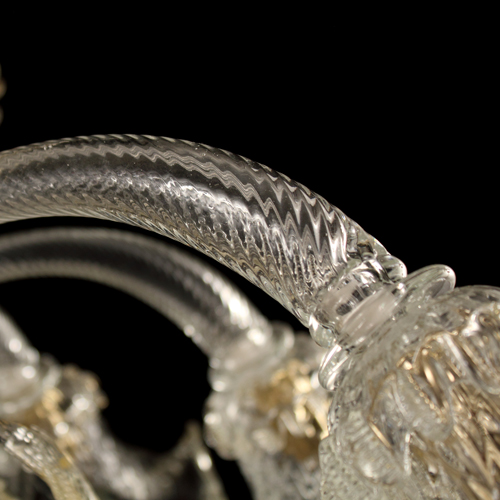 Braccio di ricambio in vetro di Murano per lampadari, colore puro trasparente. Si tratta di un elemento classico, utilizzato nella produzione di lampadari artigianali in stile veneziano, lampadari classici e altri lampadari artigianali in vetro soffiato. La superficie del braccio è lavorata a rigamenà, tipica tecnica di lavorazione veneziana. Ogni braccio è realizzato a mano da maestri vetrai, si tratta perciò di ricambi per lampadari antichi pezzi unici, e come tali le dimensioni e il peso possono discostarsi da quelle dichiarate in scheda tecnica. I bracci in vetro possono essere utilizzati per l'allestimento e il restauro di lampadari antichi in vetro.