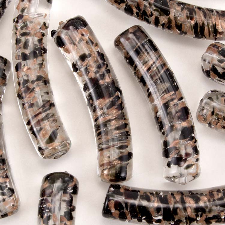 Perle veneziane Ø8x40 mm in di Murano vetro cristallino con inclusioni di pasta vitrea nero e avventurina. La forma é a tubo curvato e sono dotate di foro passante per la creazione di monili, gioielli in vetro, pezzi di bigiotteria come bracciali, orecchini, collane, cavigliere, ecc.