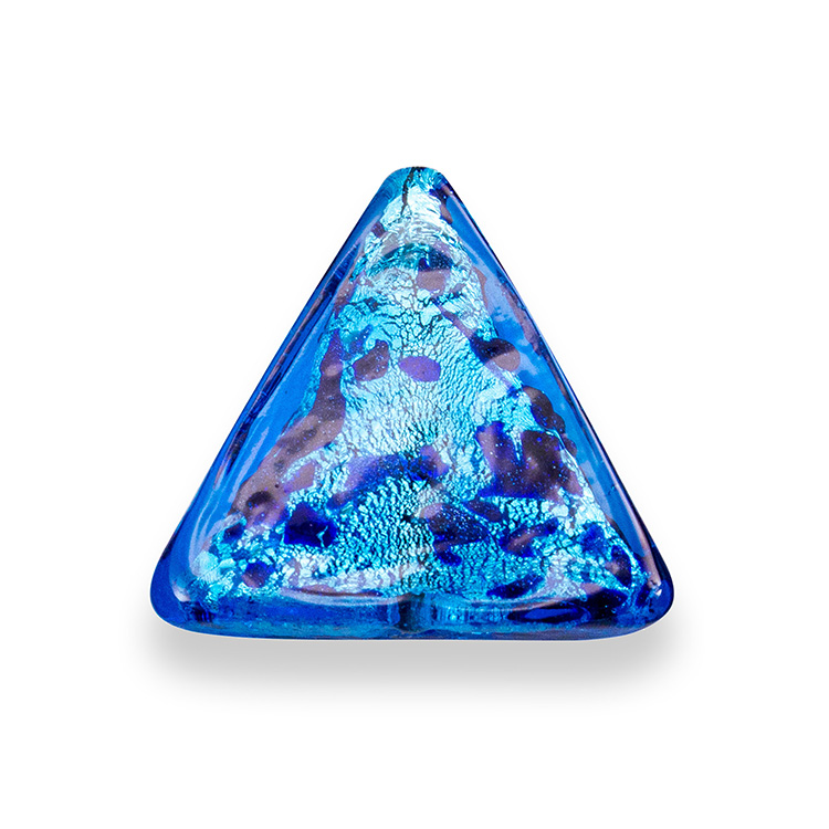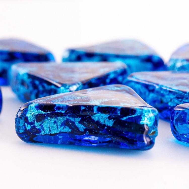 Perla di Murano triangolare 25 mm per gioielli vetro, vetro sommerso blu foglia argento. Foro passante.