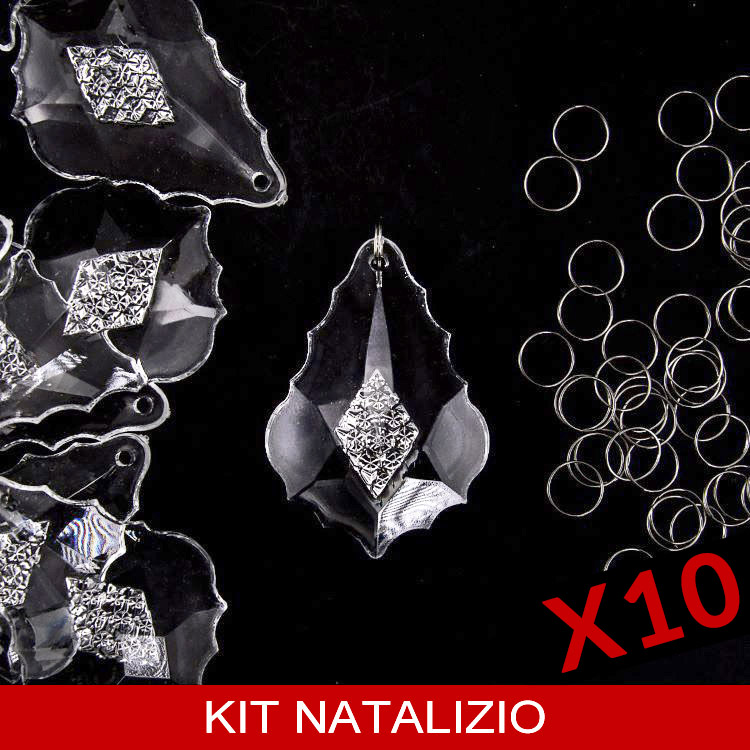 Confezione risparmio: 10 pz Pendente foglia barocca 63 mm cristallo acrilico + 10 pz anello brisè 10 mm -50%