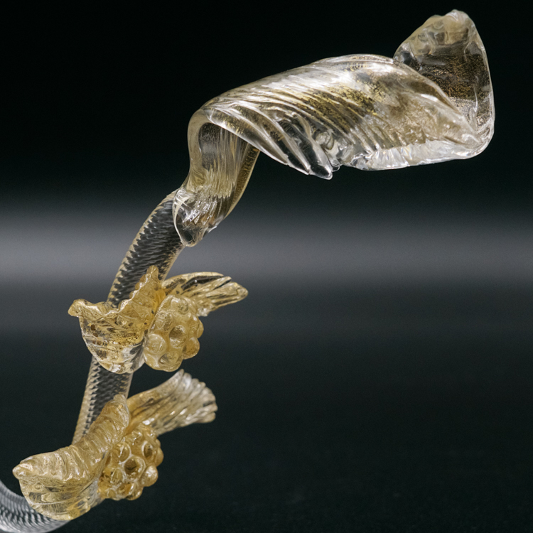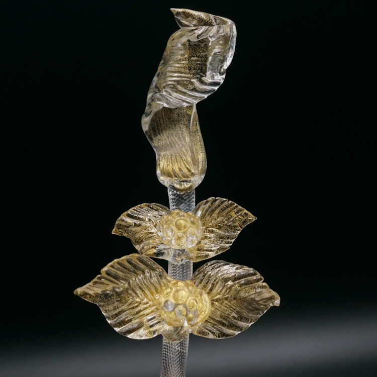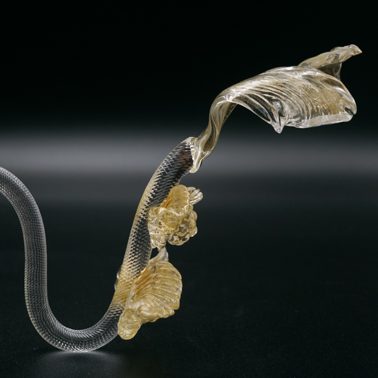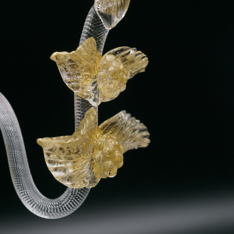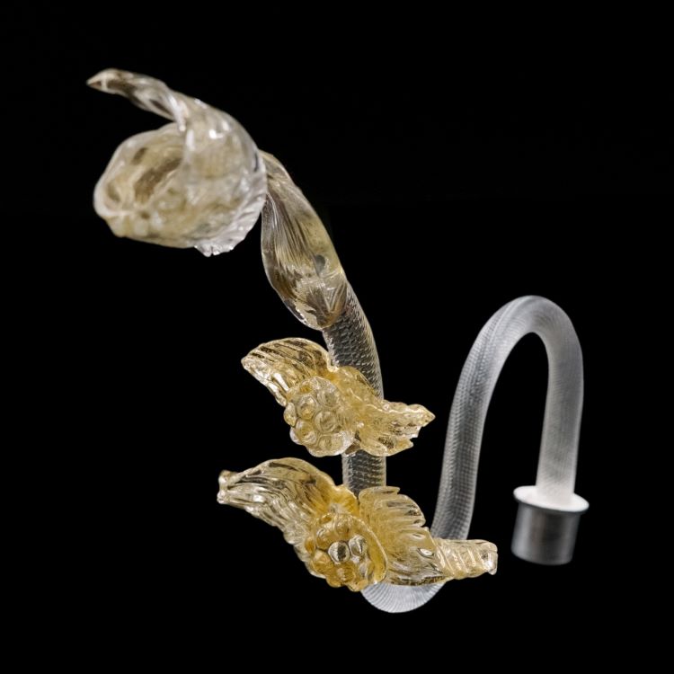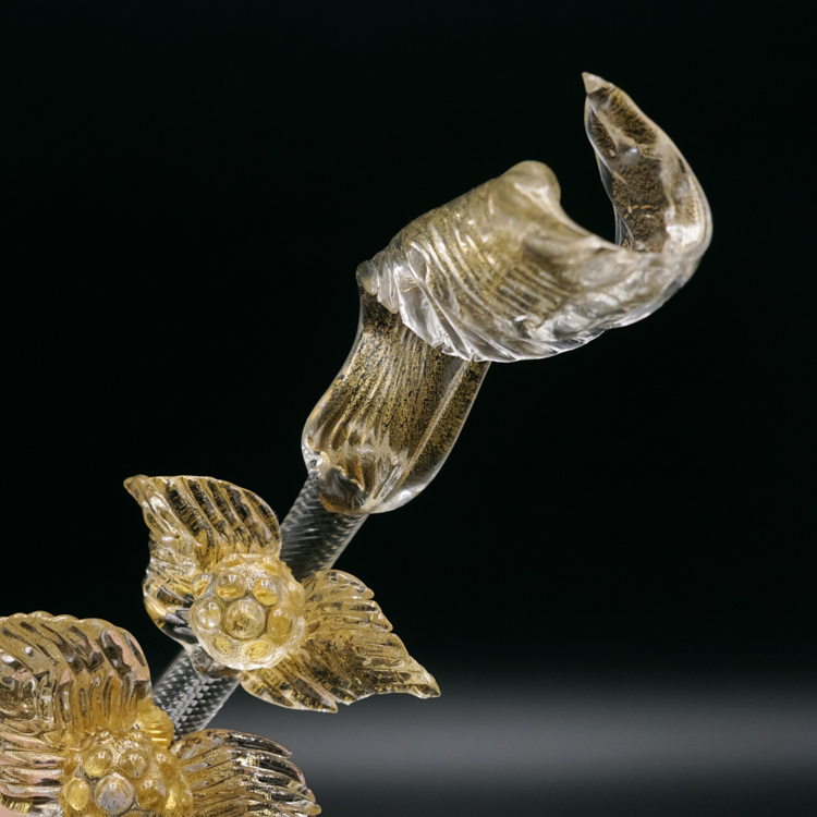 Foglia bassa in vetro soffiato, pezzi di ricambio Murano, elemento decorativo utilizzato nell'allestimento e nel restauro di lampade e lampadari in stile veneziano. La foglia è rivolta verso il basso, il colore è screziato in oro poichè viene impiegata vera foglia d'oro zecchino durante la lavorazione del vetro fuso.